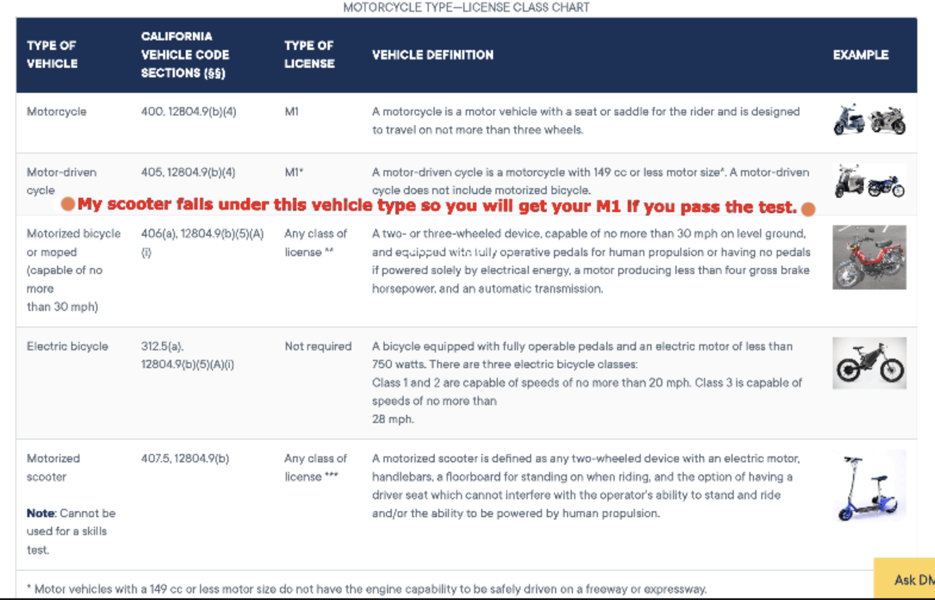 As you can see, any two-wheeled vehicle that do not have pedals requires a California M1 License to operate legally, thus you have to be able to test on them.